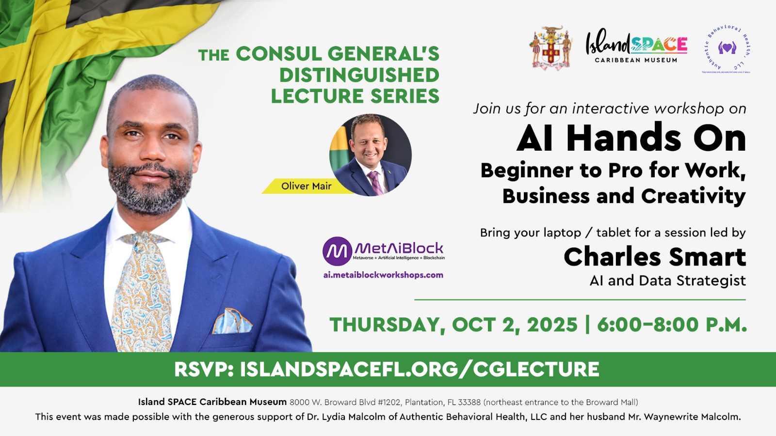Island SPACE Caribbean Museum invites you to an enlightening hands-on workshop as part of Jamaican Consul General R. Oliver Mair’s Distinguished Lecture Series. On Thursday, October 2, 2025, at 6:00 PM, we proudly welcome Charles Smart, accomplished AI and Data Strategist.