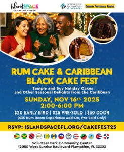 Kick off the holiday season with a flavorful celebration! Island SPACE Caribbean Museum, in collaboration with the Caribbean Professionals Network and a lineup of talented South Florida bakers, invites you to indulge in the fourth annual Rum Cake and Caribbean Black Cake Fest on Sunday, November 16, 2025, from 2:00 p.m. to 6:00 p.m at Volunteer Park Community Center, 12050 West Sunrise Boulevard Plantation, FL 33323. Savor the rich, time-honored flavors of the Caribbean as cake makers serve up samples of traditional rum cake and the beloved black cake—a dark, spiced fruitcake cherished across English-speaking Caribbean islands. This festive gathering starts at $20 for early bird, $25 for pre-sold tickets, with a $30 cost at the door. Guests will enjoy: